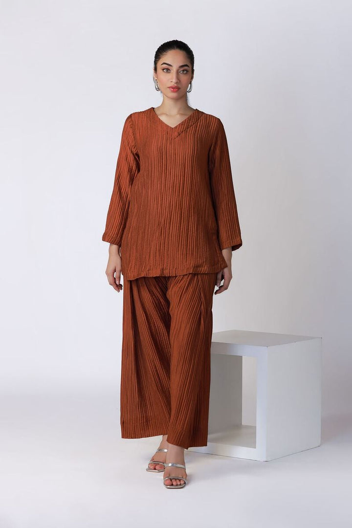 - Description: A short solid textured kurta featuring full sleeves and a V-cut neckline.