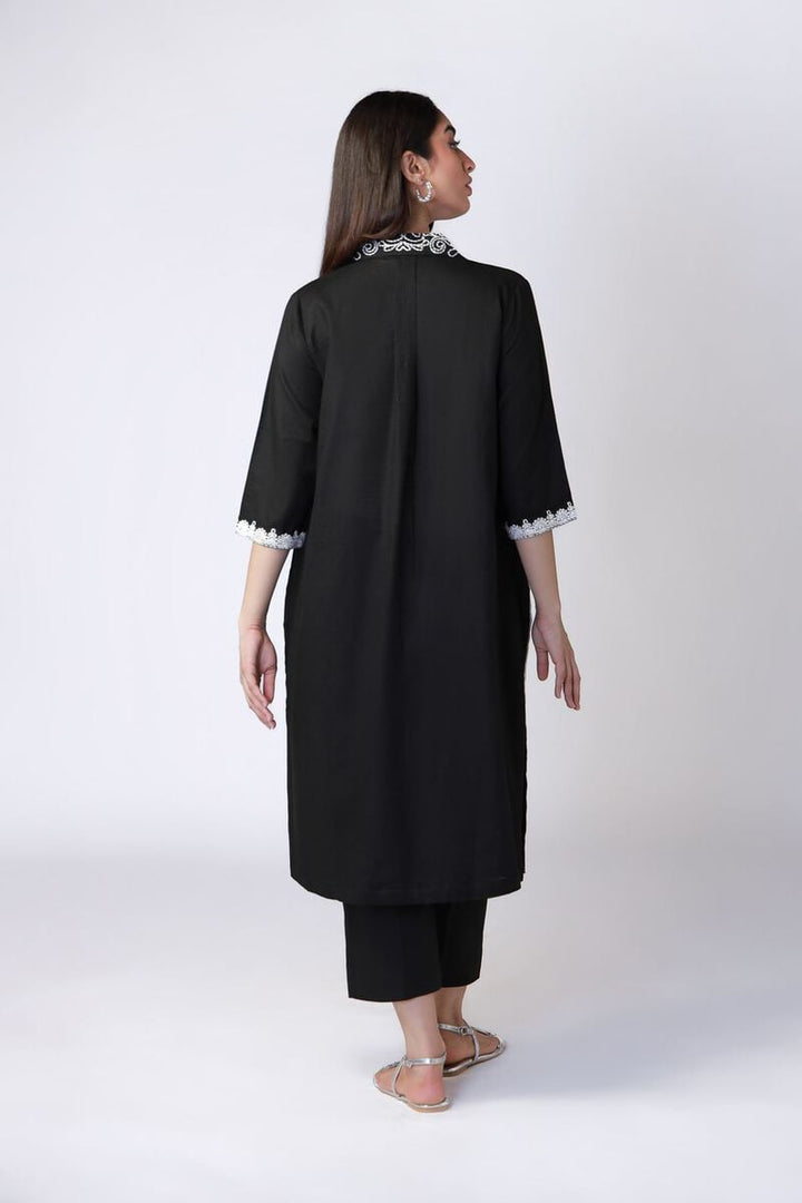 - Description: A short embroidered kurta featuring full sleeves, a V-cut neckline and tassel detailing on the front.