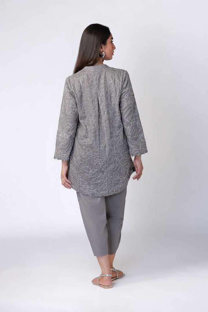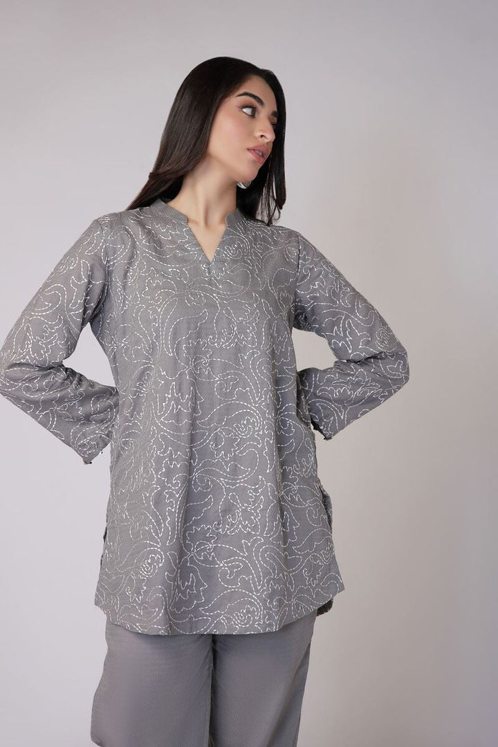 - Description: A short printed kurta featuring full sleeves with button detailing and a band collar with a V-cut.