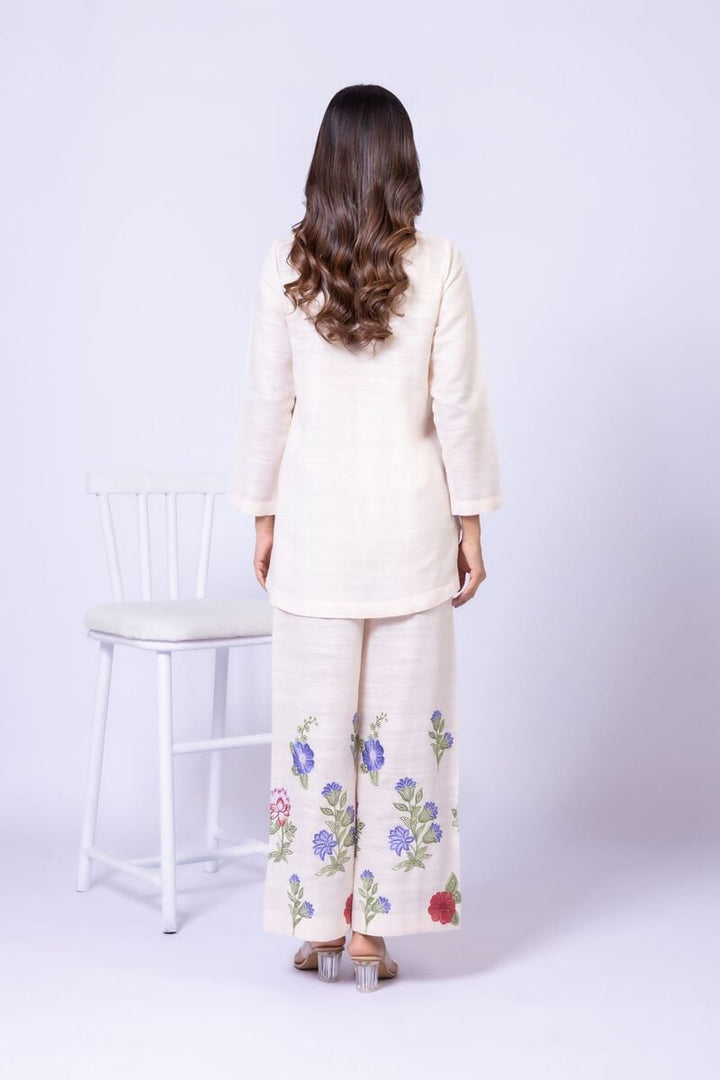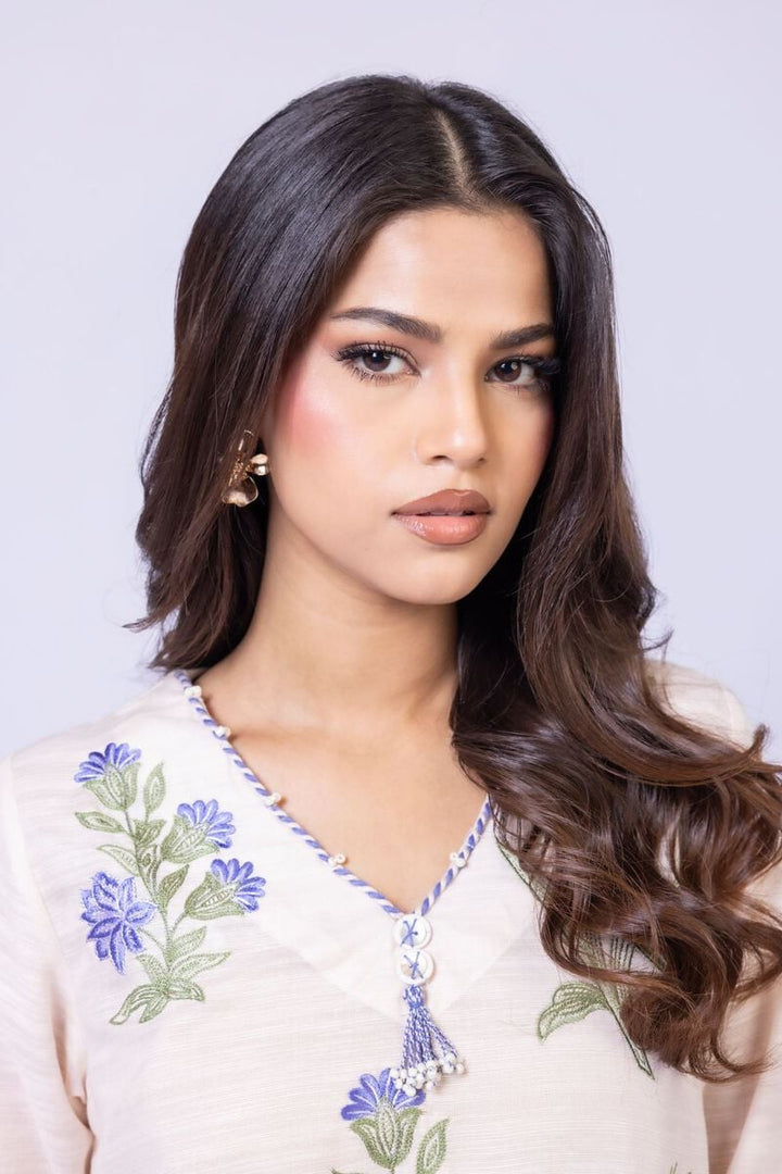 - Description: A short floral embroidered kurta featuring full sleeves, a V-cut neckline with drawstring detailing and button finishings.
