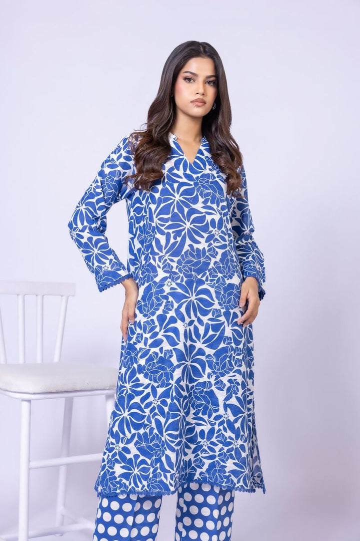 - Description: A long floral printed kurta featuring full sleeves with embroidery, a band collar with a V-cut and lace detailing on the hem.