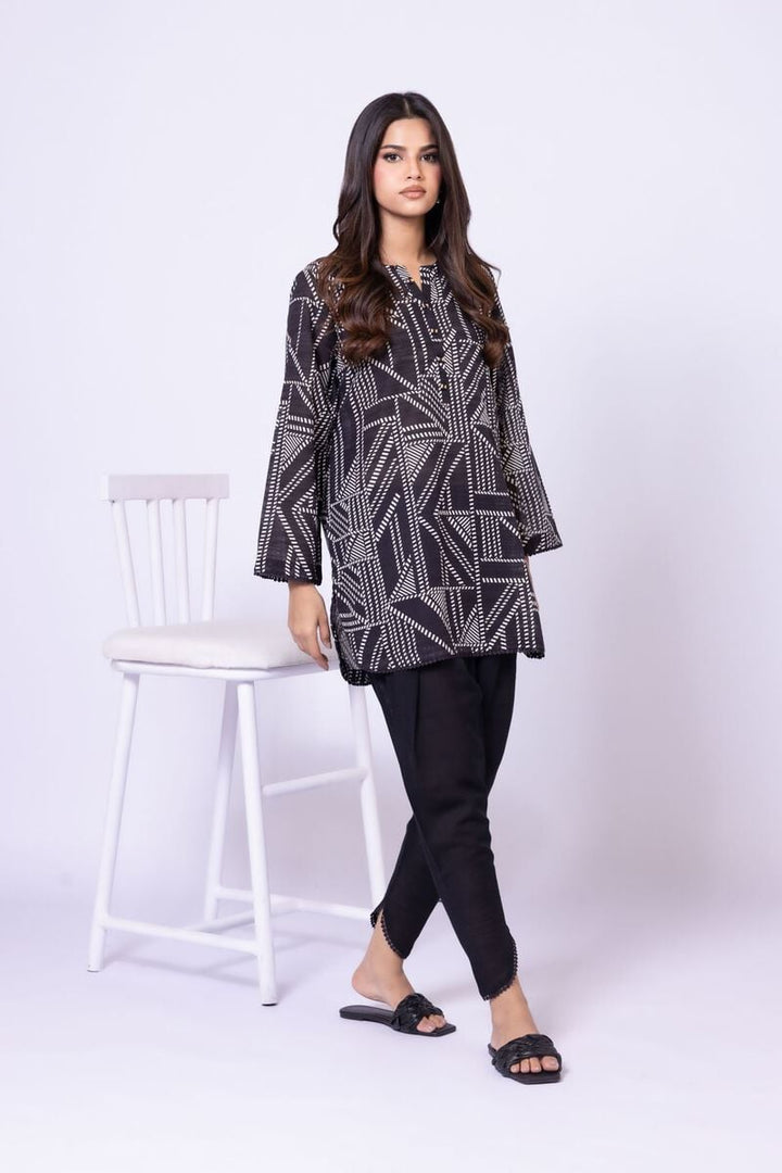 - Description: A short printed kurta featuring full sleeves and a round neckline with a V-cut and buttons on the front.